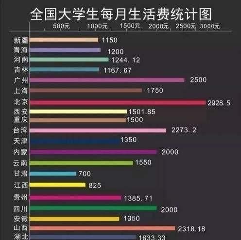 从这张统计表图中,就是一线城市的大学生生活费也没有一个超过 3000 元的,而对于经济欠发达的省份,大学生生活费明显偏低,每月只有 1000 多元就够了。