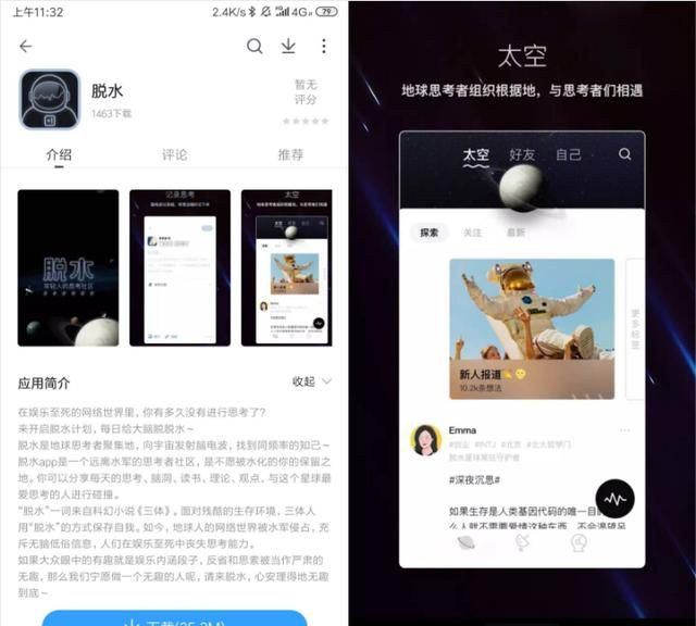 脱水这个名字取自科幻小说《三体》,意思也很明确,我们不要水军,我们要的只是一群有着天花乱堆想法的思考者。在这里你可以记录下每天的思考、想法、脑洞、观点,分享给自己的好友,分享给社区里的其他人,也分享给自己。