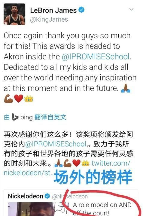 勒布朗·詹姆斯在北京时间 5 月 4 日在社交平台上发文,祝贺自己获得最受欢迎男运动员奖,细心的网友发现詹姆斯的发文中有“场外的榜样”,我相信既然詹姆斯敢这样写,他就一定是清白的。